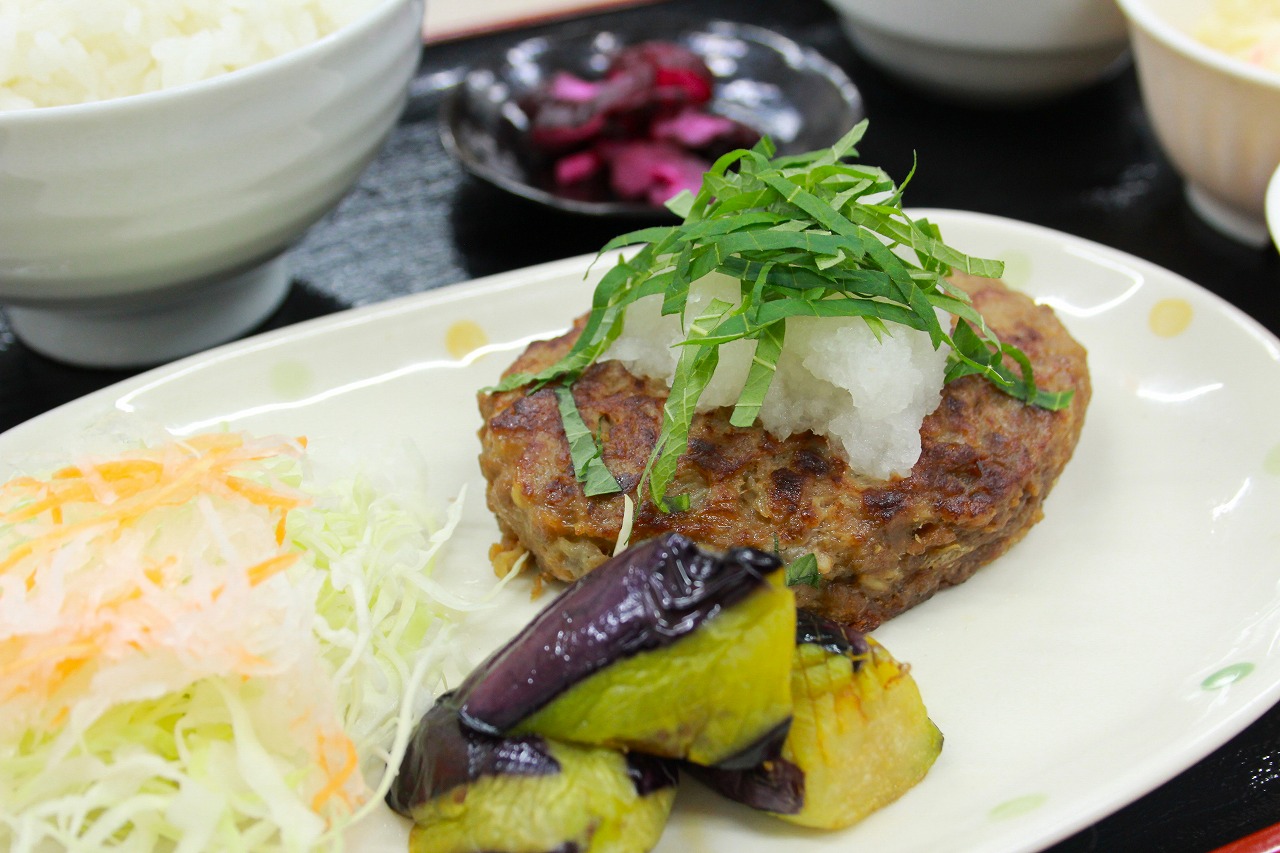 シソと大根おろしをのせて食べるさっぱりとしたハンバーグ